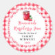 This fun and whimsical sticker features a jar of raspberry jam on a white lace doily and pink gingham background. It is perfect for labelling your homemade goods. The text combines handwritten script and serif fonts for a stylish and modern look.