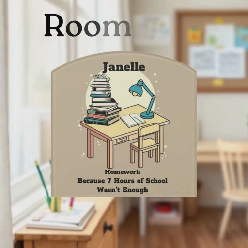Homework: Because 7 Hours of School Wasn't Enough text paired with your name and a desk piled high with books you have to read and write a report on.