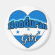 Leuke magneet met een hart afgebeeld met de Hondurese vlag erop. Op de tekst staat: Honduran girl De achtergrond is in de kleur wit. Leuk om te geven als cadeau of voor jezelf om te laten zien dat je trots bent om Hondurees te zijn. kleuren: blauw en wit.