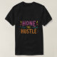 This t-shirt design features the text "Hone the Hustle." in a bold, sans-serif font, surrounded by a dynamic pattern of geometric shapes. The text is printed in a single, eye-catching colour and the shapes are in a variety of contrasting colours. The overall effect is energetic and eye-catching