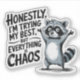 Embrace the chaos with this funny racoon sticker! Featuring a cute racoon and the relatable phrase "Honestly, I'm Trying My Best, But Everything is Chaos," this sticker is perfect for anyone who feels like life is a bit of a whirlwind. Made with durable vinyl, this sticker can be applied to laptops, water bottles, journals, and more. Add a touch of humour to your everyday essentials with this quirky and relatable design.