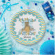 Honey Bear 2nd Birthday paper plates, a cute and fun design that features a brown teddy bear with a bee hive, bumble bees, flowers, text that reads It's My 2nd Birthday, a blue decorative ring, and a border of blue, teal, gold, and white chevron stripes. Easily add the birthday child's name to these honey bear paper plates to personalise them!