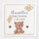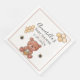 These custom baby shower napkins feature a cute bees and honey theme. A cute little bear eating honey is pictured at the bottom with two bees buzzing near. Illustrated honeycomb accents the text area in the centre. A sample name is printed above an event, "Baby Shower" followed by the date of the celebration. You can personalise the napkins to include your own party information or other custom text.
