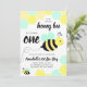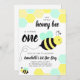 A honey bee themed birthday party invitation; perfect for a first birthday, but customisable for any age. Feature hexagonal honey-comb border and whimsical bee design in shades of pale yellow and mint green.