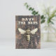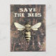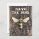 Big illustration of a bee on inverted antique handwritten script background with big message "Save the bees" and some herbs in monochromatic sepia beige tones perfect for bee and nature lover, beekeeper. World Bee Day is observed on 20 May each year to draw attention to the essential role bees and other pollinators play in keeping people and the planet healthy.
