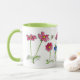 A pretty botanical mug featuring bright pink cosmos flowers, blue nigella and honey bees drawn in black ink and painted with watercolor. A nice mug for a gift for a friend!
