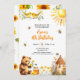A sweet Birthday theme with bees, baby bear, a hive, little birds and yellow flowers on the front and lovely sunflowers on the back! You can personalise this invitation with your own details.