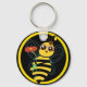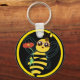 This bright yellow and black bee with big warm brown eyes is smiling as she holds close an orange and yellow flower. Her wings are sheer and she has a honeycomb flower at the base of one curvy antenna. The background can be any colour.