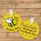 Smiling flying bee cartoon over seamless bee-hive background. Custom text on both sides.