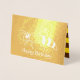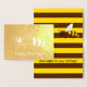 The front has a cartoon honeybee and "Happy Birthday" in foil. The inside has a striped brown and yellow background, the honeybee in colour, and the punny message "Bee happy on your birthday!"