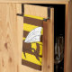Two cartoon honeybees on a yellow and brown beestripes background. The bees face different ways, so that they'll both be the right way up when hung over a towel rail.