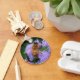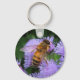 This keychain features a honeybee on purple ageratum flowers in a circle of green on a warm summer day.