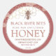 Chiseled metallic honeycomb background with stylised bee and dashed border. Terracotta border and reddish-brown text on white background.