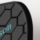 This modern pickleball paddle design features a cool honeycomb pattern in blue and black, with your name in bold blue lettering for a look that is simple and stylish, yet professional.