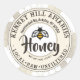 "Windowpane bee" on a backdrop of honeycomb with the word "honey" written in bold, eye-catching script. Your apiary name and honey description is printed in a slightly distressed (non-commercial) homestyle font.