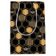 This contemporary design features a geometric gold colour beehive pattern, bumblebees, and a black colour background.