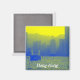 Blue and yellow pop art image of Hong Kong bay with a junk boat sailing towards the city