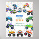 Honk! beep! vroom! monster trucks boy birthday item. Colorful and super cute. Editable name