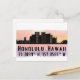 Postcard features Honolulu Hawaii city skyline silhouette with watercolor splash and latitude & longitude map coordinates