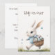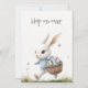 Invite your guests to a whimsical spring celebration with this double-sided "Hop on over" Easter invitation. The front features a soft watercolor illustration of a white bunny in a blue chequered sweater, joyfully carrying a basket of speckled eggs. The backside is dedicated to your party details, offering a clear and organised layout for your brunch or egg hunt information. It is a charming and high-quality choice for a family-friendly holiday gathering.