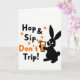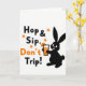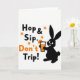 Designed with a crisp white background, the card features a long-eared rabbit silhouette in solid black, stepping forward on the right with a friendly, upbeat posture 🐇. Small white facial marks hint at a soft smile, giving the bunny an approachable look, like it’s sharing a fun moment with someone just off the page. In one paw, it holds a tall glass filled with bright orange, fizzy-looking drink, topped with a citrus wedge that adds a flirty, celebratory touch. On the left, the phrase “Hop & Sip. Don’t Trip!” is set in a sturdy sans-serif style, arranged in two short lines for easy reading. “Hop & Sip” and “Trip!” appear in black, while “Don’t” stands out in orange to echo the drink and draw the eye. A handful of small orange five-point stars sprinkle around the text and between the words, adding a light, friendly sparkle 🌷. The bunny’s forward stride, the angled glass, and the scattered orange stars create a lively diagonal flow across the white space.