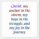 Hope and Joy in Christ: "Christ, my anchor in the storm, my hope in the struggle, and my joy in the journey" This quote means that in the midst of life's challenges and uncertainties, Christ provides stability and strength.