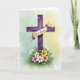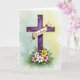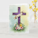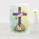This design shows a regal purple cross centered on the card, edged with gold and set against a soft watercolor wash that shifts from calm teal into gentle yellow. Small white and lavender flowers decorate the cross, like a quiet bouquet offered with care. A cream banner drapes across the middle bar, and its folds look like smooth fabric resting in place. The message sits on the banner in neat, dark lettering that stands out clearly against the light background. At the base, white lilies rise among yellow blooms and soft pink petals, surrounded by layered green leaves, with a few 🌷 accents that add a tender, friendly touch. The lighting stays gentle and diffused, giving the scene a calm, close-to-the-heart warmth without any harsh shadows. Gold edging catches the light along the cross while the clustered flowers form a full, detailed garden at the bottom 🐇.