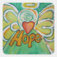 The word for "Hope", is painted in golden yellow shades with red accents. The green angel has white and gold wings with light pink for contrast. The acrylic painting has sparkle from a light layer of glitter. Customise this inspirational word sticker with your own words to make special guardian angel decals for events!