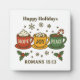 Fun holiday plaque with a cute hot cocoa design red, yellow and green cups of cocoa with whipped cream, marshmallows and a candy cane, adorned with snowflakes and holly. Happy Holidays and a scripture message Romans 15:13 "Now the God of hope fill you with all joy and peace in believing, that ye may abound in hope, through the power of the Holy Ghost."