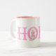 A kitty wrapped in a pink ribbon sits in the 'o' of the word Hope in pink on this sweet inspirational mug.