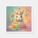 A playful little bunny sits proudly with a vibrant birthday cake. The bunny is surrounded by soft pastel hues, whimsical decorations and balloons, creating a joyful and celebratory atmosphere perfect for a special day.