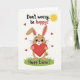 This card shows a light-brown bunny-like character standing on a narrow strip of green grass, smiling with rosy cheeks and bright, friendly eyes 🐰. One long ear is topped with a white bow dotted in soft pink, adding a gentle, flirty touch to the pose. The character hugs a large red heart close to its chest, as if offering it to someone special with a tender, reassuring look. Near the top, the phrase “Don’t worry, be hoppy!” appears in mixed black and red lettering, spaced above the character on the white background. In the upper right, a simple yellow sun with short rays adds a sunny corner accent, while small fuchsia hearts drift around like little love notes. Along the bottom, “Happy Easter!” is written in green text that sits just above the grass line 🌷. Scattered fuchsia hearts float across the white backdrop, with the brightest cluster near the bunny’s raised ear and bow.