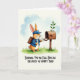 This card shows a friendly, human-like rabbit delivering mail, dressed in a blue jacket over a white shirt with a matching blue cap, its soft orange fur and gentle smile aimed toward the open mailbox as if sharing a sweet note with someone special 🐰. One paw slides a small white letter into the slot while the other steadies the mailbox door, giving the moment a caring, between-friends kind of tenderness. A sturdy brown satchel sits on its back, adding to the tidy, on-duty look. The scene is set on fresh green grass under a pale blue sky with light clouds, keeping the background calm and airy 🌷. A tiny green sprout grows from the top of the rustic brown mailbox, hinting at springtime arriving. Centered beneath the illustration, the message “SENDING YOU AN EGG-SPECIAL DELIVERY OF HOPPY MAIL!” appears in thick, decorative lettering in a dark tone that stands out against the light space. The mailbox is a warm brown with an open lid, and the little sprout is a bright green tuft at the very top.