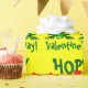 Happy green cartoon frogs with red hearts. Hoppy Valentine's Day!