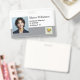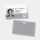 Name and photo badge for employees or volunteers. Also include a company logo. Dark grey and white, neutral colours for any business. The photo template is on the left with two, black, printed, text templates beside the photo. His or her name is in bolder print with a place to add up-to three more lines. The logo template is in the bottom righthand corner. The reverse is solid grey.