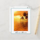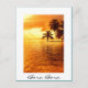 Postcard with a horizontal palm tree hanging over the water of the pacific ocean during sunset on a tropical island with a white border and the text: 'Bora Bora'.