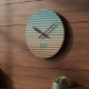 A stylish clock with horizontal stripes in brown, beige and blue in a modern minimalist design style with a touch of beach vibes.