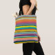 This tote bag has a design of horizontal stripes in shades of blue, green, brown, purple, red, yellow, orange, and pink.