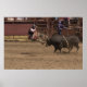 Bull rider takes flight with the assistance of an angry bull in a rodeo competition