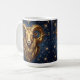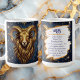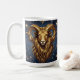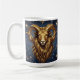 A mystical golden Ram Aries Astrology sign coffee mug with Aries dates and traits on the back, along with compatibility and other fun Aries facts.