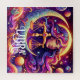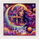 Ai art depicting a beautiful colourful woman surrounded by purple, pink and orange scales, planets, stars, moons and swirling colours. Horoscope sign Libra zodiac celestial art.