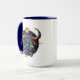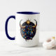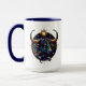 Royal blue and gold coffee cup with a bull symbol for the horoscope sign Taurus with star background. A striking ai art illustration.