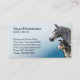A veterinary practice business card template with a photo of a cross bred cattle dog and a dapple grey Percheron horse, cut out on a graduated blue background. The template is set up for a veterinarian, whose surgery or clinic specialises in dogs and equines but equally suitable for any business involving these animals. There are spaces for appointments on the reverse, though these lines can be customised for other text. Photography by ruralfrance.