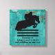 A horse and rider silhouette featuring an equestrian rider on a show jumper / hunter jumping over a fence. Turquoise coloured rusted metal background. Quote says: courage is being scared to death and saddling up anyways.