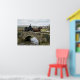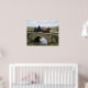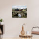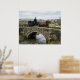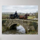 A horse-drawn carriage crosses a rustic stone bridge over a small river. The scene is set in a rural landscape with rolling hills and a distant village.