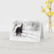 Here is a colour photo showing a beautiful brown horse with a white blaze on it's nose, standing beneath a low hanging branch heavy with snow. A weather blanket on it's back is dusted with fresh powdery flakes. Softened matte edges give the white setting a dreamlike feeling. Personalise the inside with your own special message to suit any occasion, or delete the example to handwrite your greeting.