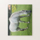 Horse jigsaw. Image of a white horse in a paddock, grazing on the grass.