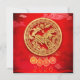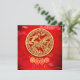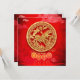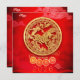 Composition with golden traditional Chinese paper-cut of a horse into a circle + "New Year Happiness" in Chinese onto small red circles + small Happy New Year in English and 2026 (customisable) into dark red decorated background. Design on square flat card with texts to customise onto the same red background in back. Perfect for Chinese New Year of the Horse 2026.