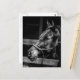 A black and white photograph of the side profile of a horse's face on a postcard.