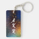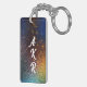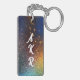A vibrant blue, white. and pink coloured keychain, displaying a modern horse pattern design. Horse lovers everywhere will love it. Both sides have text areas for customisation. Special gift for horse owners and riders.